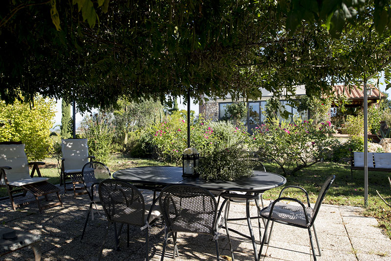 Gazebo ricoperto di profumato glicine con tavolo, sedie e sdraio; zona suggestiva per relax e cene.